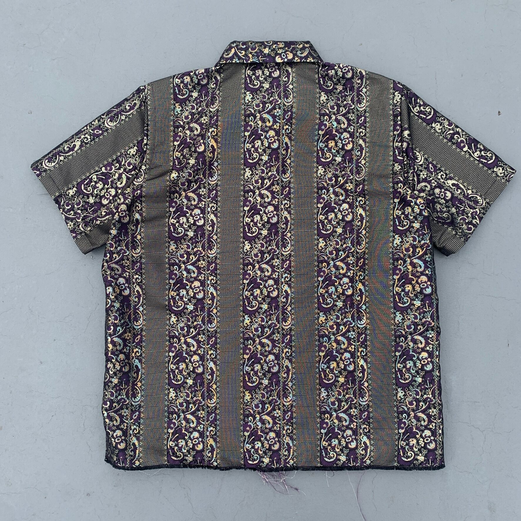 光沢感のあるゴールドベースのジャカードストライプ。紫と黒の織りで存在感がありながら品のあるシャツです。