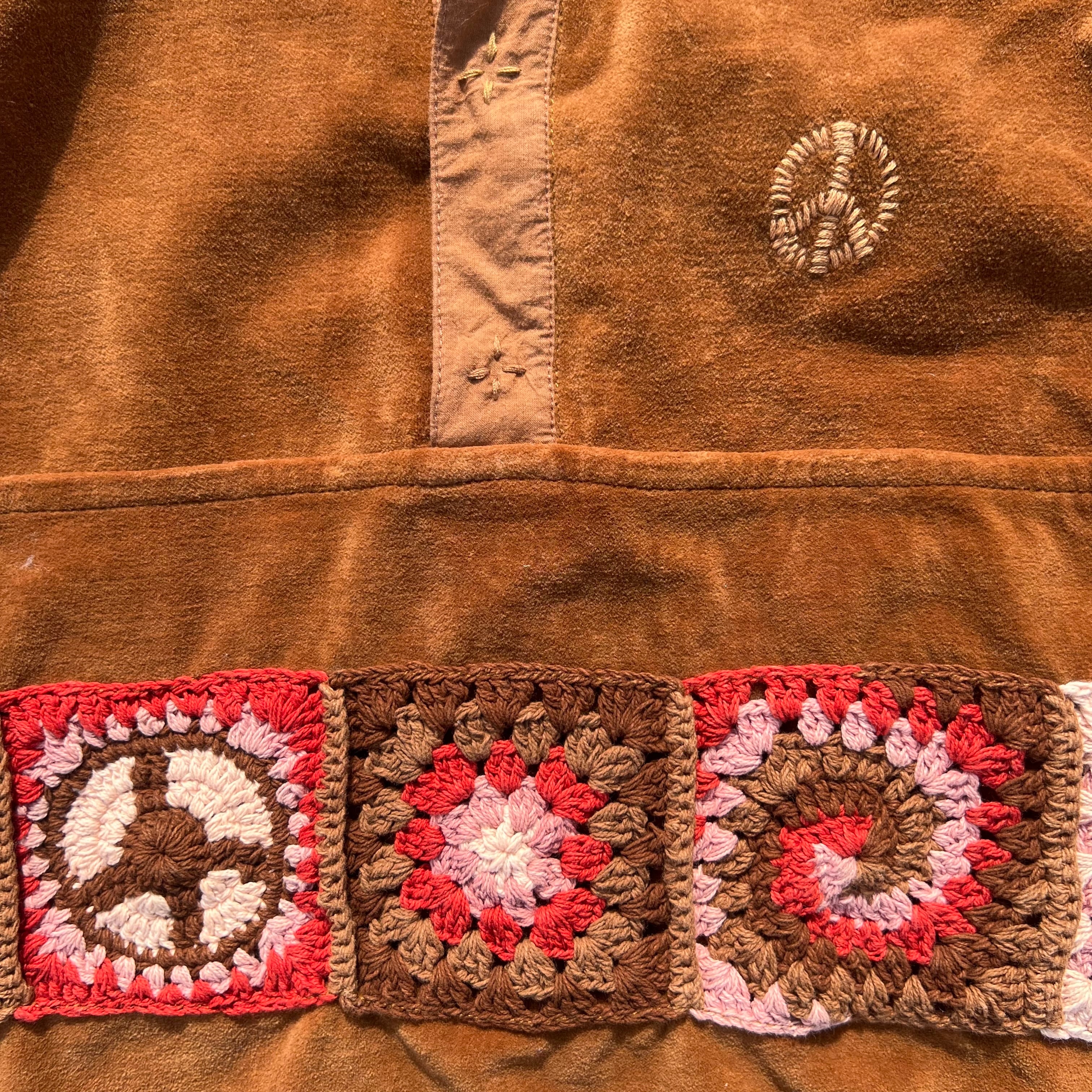 オーガニックコットンを使ったベロア素材にブロックプリントで柄を。ハンドメイドで鍵編みされたパーツを使った切り返しとブランドを象徴する1枚。